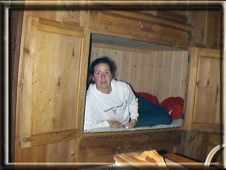 Här har vi just övernattat på Skinnaråsen, en fäbod i Dalarna. Sängarna är inbyggda för att hålla värmen på vintern, då man stänger dörrarna om sig.